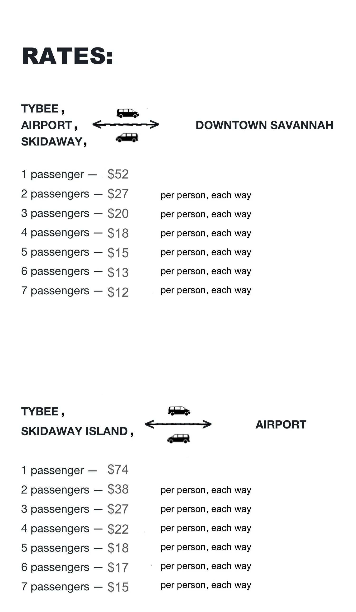**Late night / early-bird rates: an additional $15+ per van (after 10:30pm and before 7:30am)